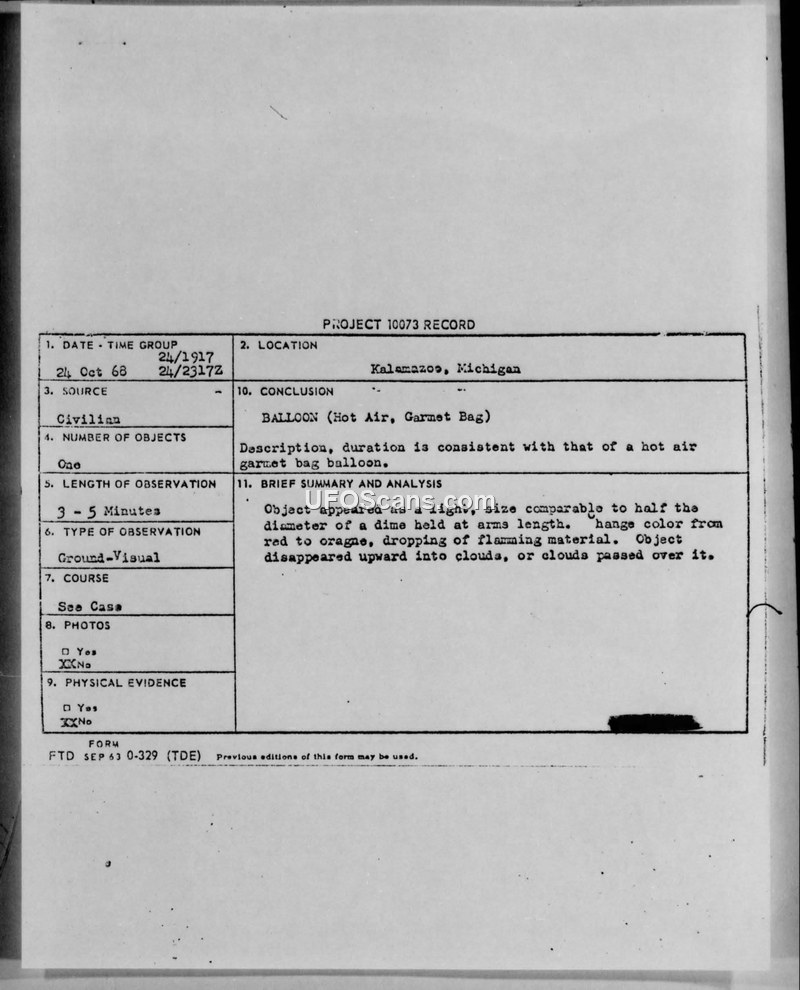 On 24 October 1968, at 2317Z, a civilian observer on the campus of the University of Western Michigan in Kalamazoo reported a sighting of an unidentified flying object. The witness, a 25-year-old psychologist, described the object as a light, comparable in size to half the diameter of a dime held at arm's length. The object was observed for three to five minutes, during which time it changed color from red to orange and appeared to drop flaming material before disappearing upward into or behind clouds. The Air Force investigation, led by 2nd Lt Herbert D. Birkhead of the 4627th Air Base Squadron at Custer Air Force Station, found no corroborating evidence from local police, university security, the 34th Air Division, or local airport control towers. The investigation noted that there were no planes burning in the area, though the Kalamazoo Fire Department reported a brush fire a few miles away. The official conclusion reached by Lt Col Hector Quintanilla, Jr., Chief of the Aerial Phenomena Branch, was that the object was a hot air garment bag balloon. The report suggests the object could have been a student-made hot air device or burning cinders from the nearby ground fire, noting that the lack of additional witnesses in a metropolitan area was a significant factor in the assessment.