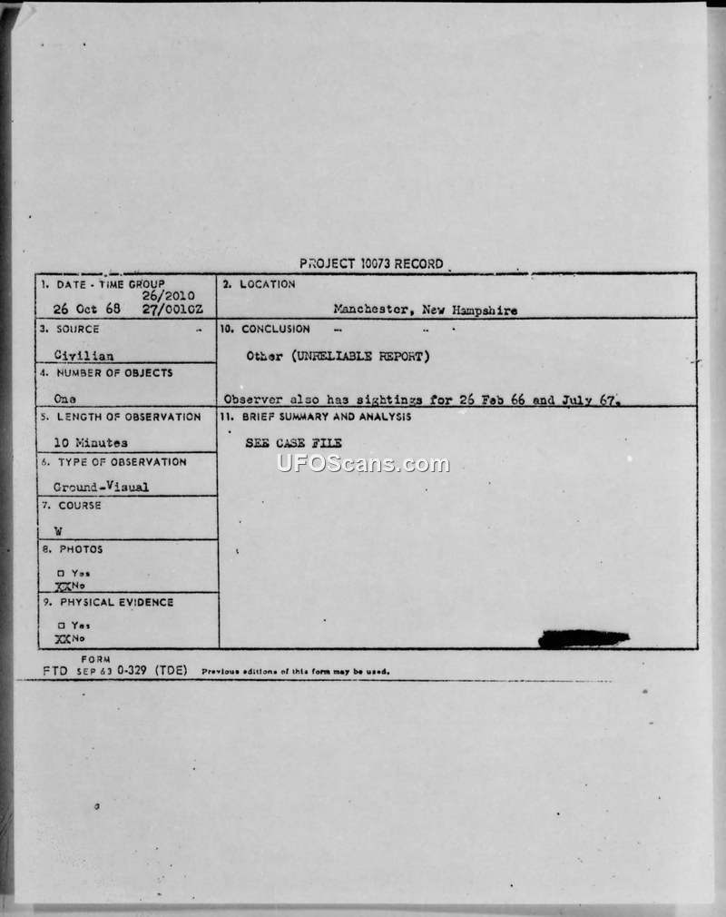Project 10073 Record — Manchester, New Hampshire, October 26, 1968