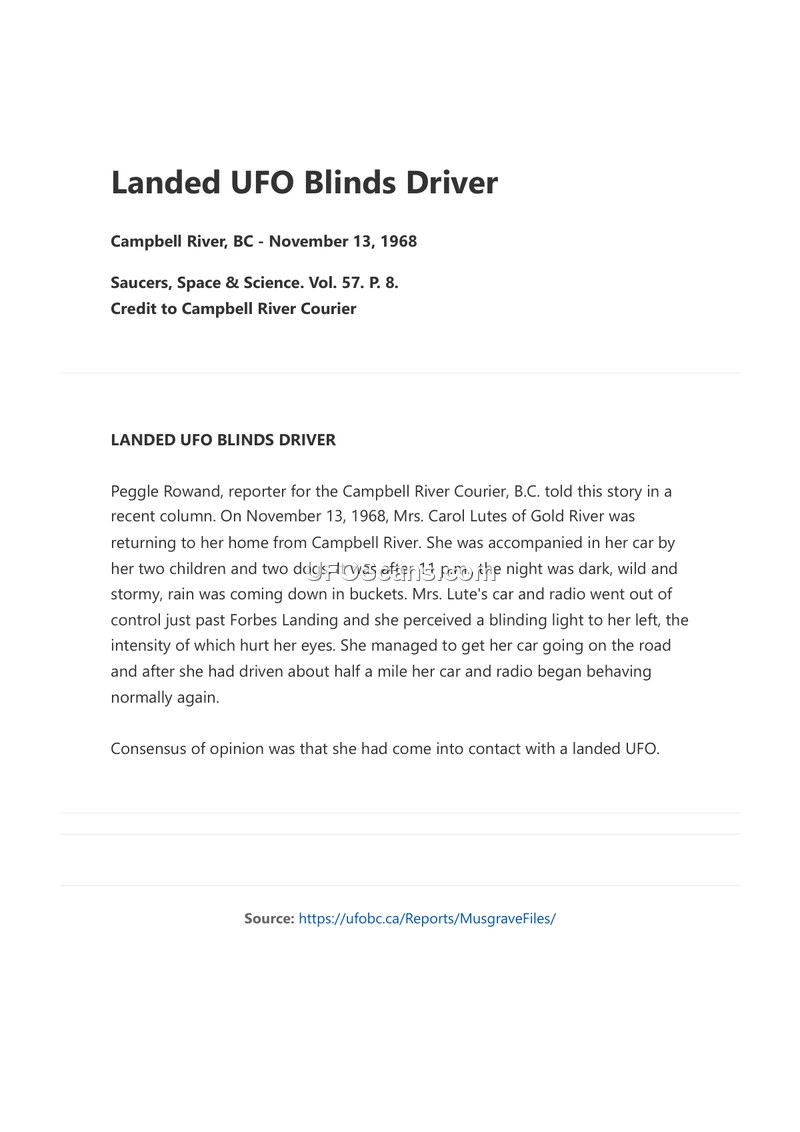On the night of November 13, 1968, Mrs. Carol Lutes of Gold River, British Columbia, was driving home from Campbell River accompanied by her two children and two dogs. The weather conditions were severe, described as dark, wild, and stormy, with heavy rain. While driving past Forbes Landing, Mrs. Lutes experienced a sudden failure of her vehicle and radio. Simultaneously, she observed a blinding light to her left, which was intense enough to cause her physical pain in her eyes. After she managed to resume driving and traveled approximately half a mile, both her car and radio returned to normal operation. The incident was later reported in a column by Peggle Rowand of the Campbell River Courier. The prevailing consensus regarding the event was that Mrs. Lutes had come into contact with a landed Unidentified Flying Object.