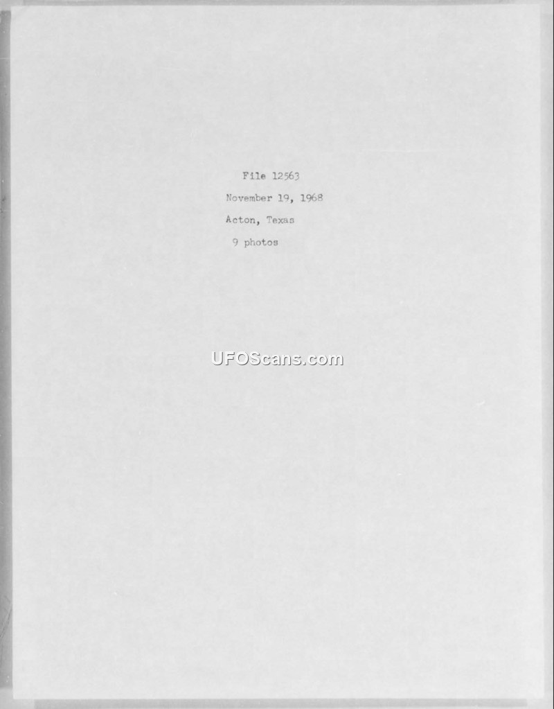 This document, identified as File 12563, serves as a record of a sighting incident that occurred on November 19, 1968, in Acton, Texas. The file consists of a cover page and a series of photographic records. The cover page explicitly lists the file number, the date of the incident, the location, and notes the inclusion of nine photographs. The subsequent pages contain visual documentation of the site, including rural landscapes, a road, a fence line, and a structure. One of the photographs clearly depicts an unidentified aerial object in the sky above a field. The object appears to be circular or disc-shaped with a visible trail or light effect. No further narrative, witness testimony, or official analysis is provided within the document pages.