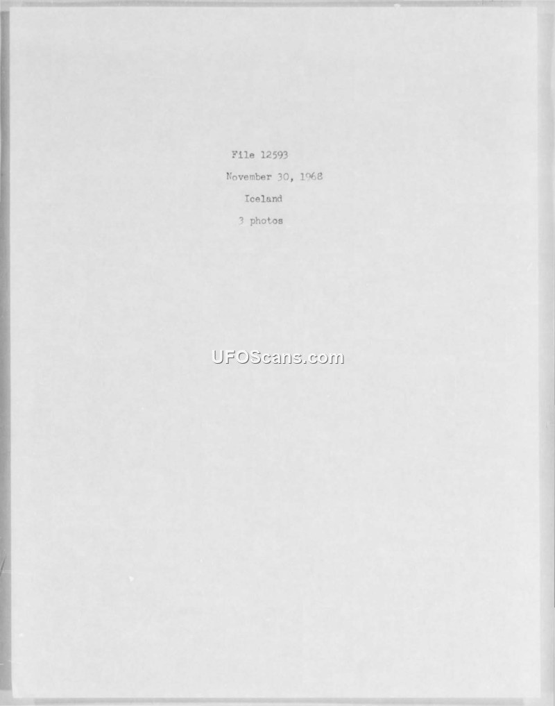 This document, identified as File 12593, consists of a brief report and three accompanying photographs regarding an unidentified aerial phenomenon observed in Iceland on November 30, 1968. The documentation provides minimal narrative context, serving primarily as a record for the photographic evidence. The second page of the document contains a sketch or annotated photograph depicting a ridge and a mountain identified as Heljaridalsfjall, with a circular object labeled 'UFO?' positioned between the terrain features. The third page appears to be a photograph showing a similar landscape with a small, bright point of light visible. The fourth page shows a landscape photograph featuring a tall antenna or mast in the foreground, with a distant horizon line. No further descriptive details, witness statements, or official conclusions are provided within the provided pages.