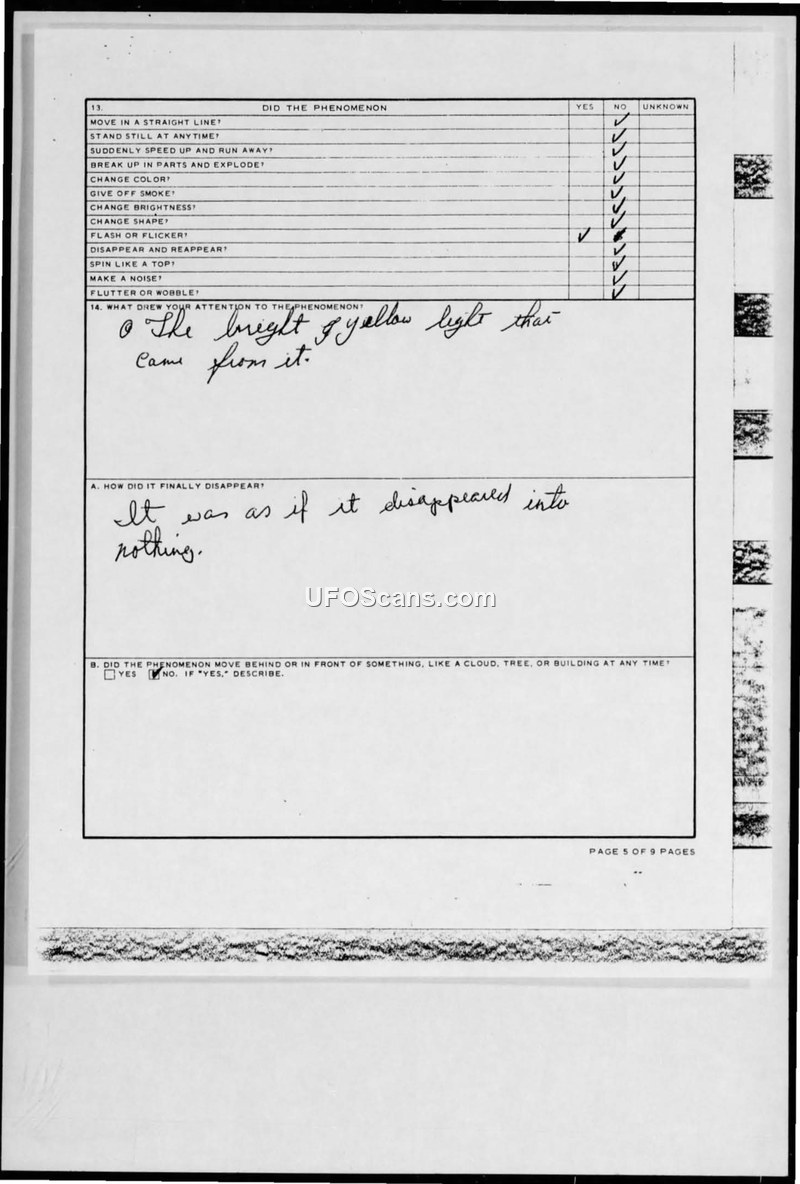 This document is page 5 of a 9-page sighting report. It consists of a questionnaire regarding the characteristics of an observed phenomenon. The witness indicated that the phenomenon did not move in a straight line, did not stand still, did not speed up or run away, did not break up or explode, did not change color, did not give off smoke, did not change brightness, did not change shape, did not disappear and reappear, did not spin like a top, did not make a noise, and did not flutter or wobble. The witness noted that what drew their attention to the phenomenon was 'the bright yellow light that came from it.' Regarding how the object disappeared, the witness stated, 'It was as if it disappeared into nothing.' The witness also confirmed that the phenomenon did not move behind or in front of any objects such as clouds, trees, or buildings.