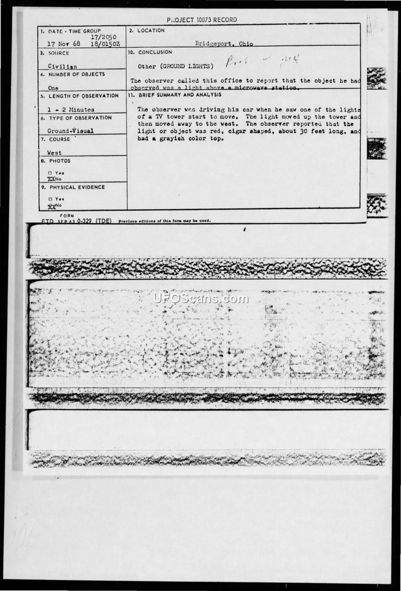 On November 17, 1968, at approximately 2050 hours, a civilian witness in Bridgeport, Ohio, observed an unidentified aerial phenomenon. The witness, who was driving a vehicle on a four-lane interstate at 50-60 mph, reported seeing one of the lights on a TV tower begin to move. According to the witness, the object moved up the tower and then proceeded to move away to the west. The witness described the object as being cigar-shaped, approximately 30 feet long, red in color, and possessing a grayish-colored top. The observation lasted between one and two minutes. The witness noted that the object appeared to move faster than a helicopter. Following the report, the Air Force's Aerial Phenomena Office, led by Lt. Colonel Hector Quintanilla, Jr., contacted the witness to request further information via an AF Form 117, noting that the initial report was insufficient for a scientific investigation. A subsequent memo for the record, dated November 21, 1968, indicates that the witness spoke with Colonel Quintanilla and reiterated that the object he had observed was a light above a microwave station. The official conclusion recorded by the Air Force for this incident was 'Other (GROUND LIGHTS).'
