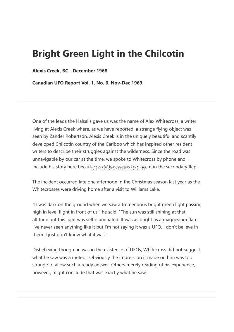 This document, an excerpt from the Canadian UFO Report (Vol. 1, No. 6, Nov-Dec 1969), details a sighting reported by Alex Whitecross, a writer residing in Alexis Creek, British Columbia. The incident occurred in December 1968, during the Christmas season, while Whitecross and his family were driving home from a visit to Williams Lake. According to Whitecross, they observed a 'tremendous bright green light' in level flight. He noted that while it was dark on the ground, the sun was still shining at the altitude of the object, which appeared to be self-illuminated and as bright as a magnesium flare. Whitecross explicitly stated that he did not believe in UFOs and was unable to identify the object, though he rejected the idea that it was a meteor due to the strange nature of the experience. The article notes that the report was obtained via a lead from the Halsalls and mentions a previous sighting in the same area by Zander Robertson.