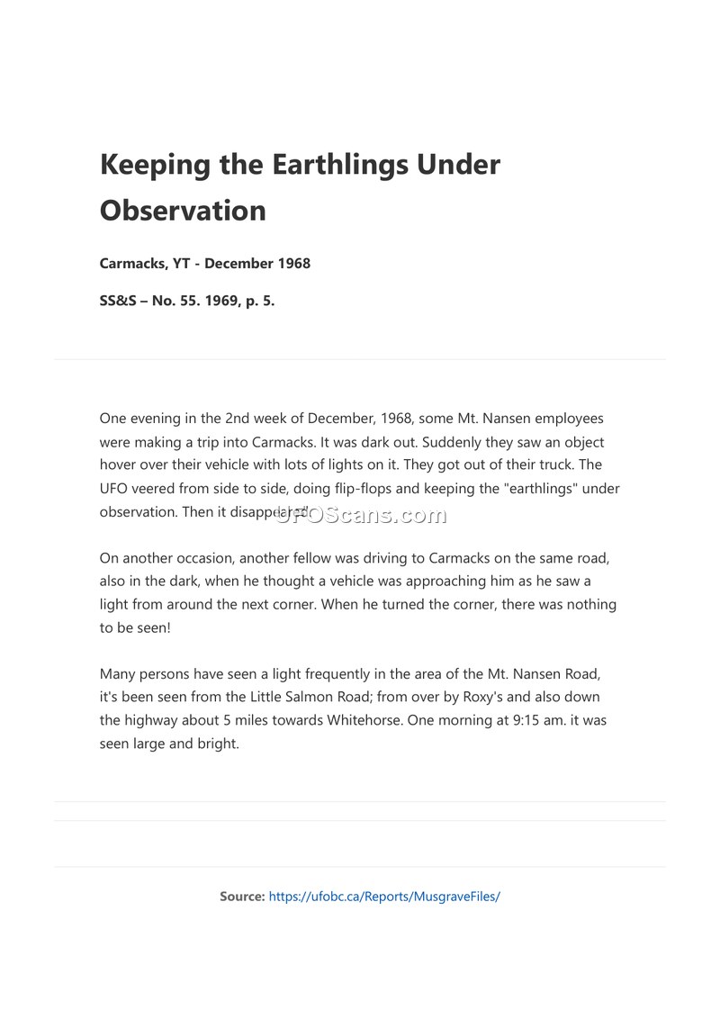 This report documents multiple sightings of an unidentified light or object near Carmacks, Yukon, in December 1968. Witnesses described erratic aerial behavior and frequent occurrences in the Mt. Nansen Road area.