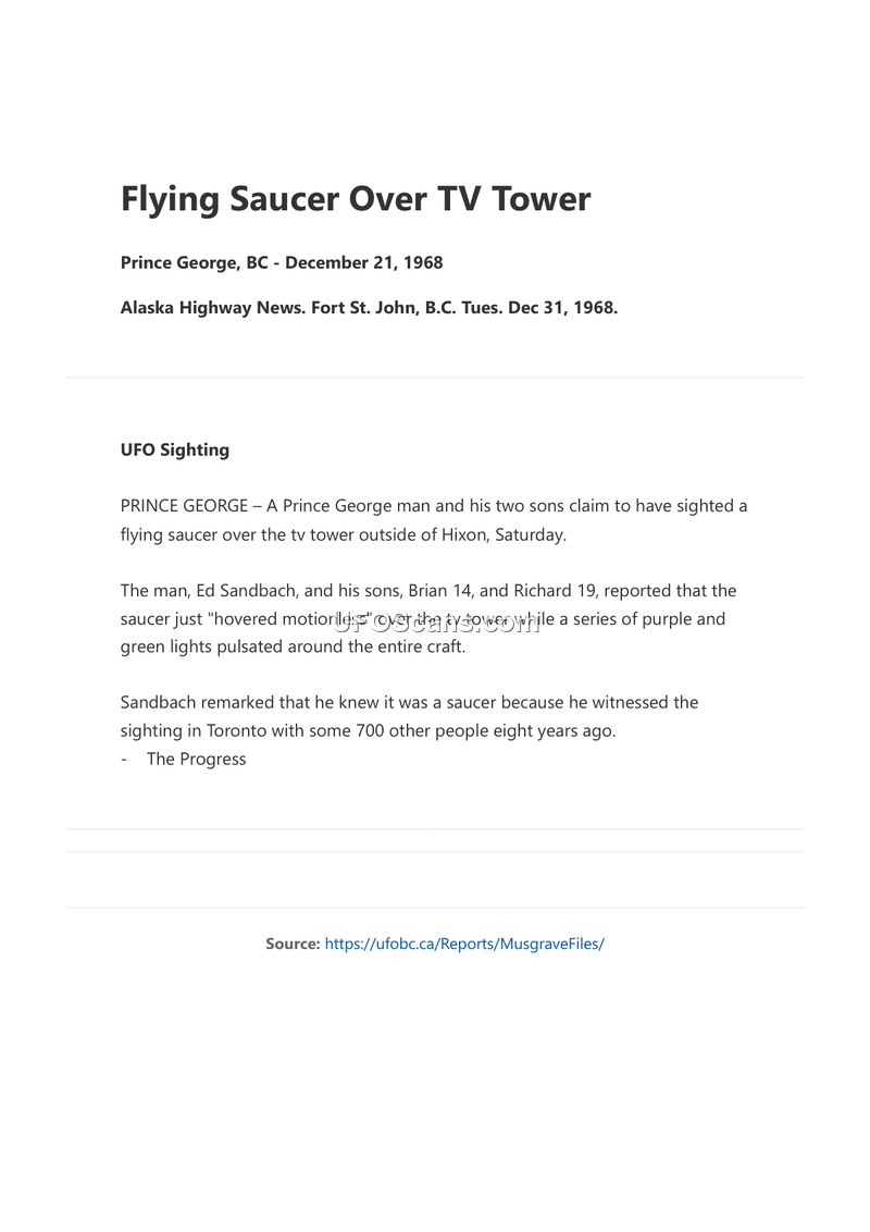 On December 21, 1968, a resident of Prince George, British Columbia, named Ed Sandbach, along with his two sons, Brian (14) and Richard (19), reported observing an unidentified aerial phenomenon. The witnesses claimed to have seen a flying saucer hovering motionless over a television tower located outside of Hixon, British Columbia. According to the report, the craft was characterized by a series of purple and green lights that pulsated around its entire structure. Ed Sandbach stated that he was confident in his identification of the object as a flying saucer, citing a previous sighting he had experienced in Toronto eight years prior, which he claimed was witnessed by approximately 700 other people. This account was published in the Alaska Highway News on December 31, 1968, with credit given to The Progress.