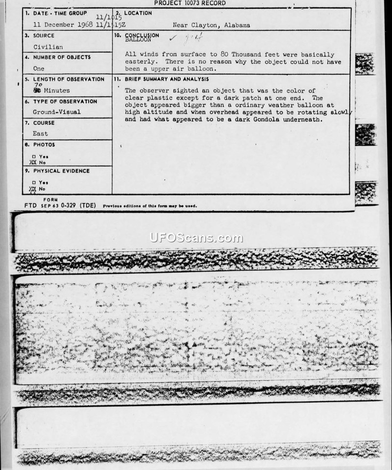 On 11 December 1968, a civilian observer with maritime experience reported a sighting of an unidentified aerial object near Clayton, Alabama. The observer, a 45-year-old merchant marine deck officer, first noticed the object after overhearing field hands discussing it. The observation lasted for one hour and ten minutes, from 1515Z to 1635Z. The witness described the object as a clear, plastic-like, dirigible-shaped craft with a dark patch at one end and a potential dark gondola underneath. The object appeared to rotate slowly in a vertical plane while overhead. The witness estimated the object's size to be larger than a standard weather balloon at high altitude and compared its visual size to the planet Venus on a clear night. The object followed a general course of 70-80 degrees before gradually becoming invisible in the eastern horizon haze. The observer was noted by the investigating officer, Ben Z. M. Gershater of the Office of Foreign Technology, as being knowledgeable about aerial phenomena and terminology, though his reliability could not be definitively judged. Official analysis by the Air Force suggested the object was likely a weather balloon or a small, isolated cirrus cloud at high altitude, despite conflicting meteorological data regarding wind patterns that made a balloon trajectory from Eglin AFB to the sighting location appear unlikely. The report includes detailed meteorological data, including wind speeds and temperature inversions at various altitudes, provided by the 6th Weather Wing at Eglin AFB to assist in the evaluation of the sighting.