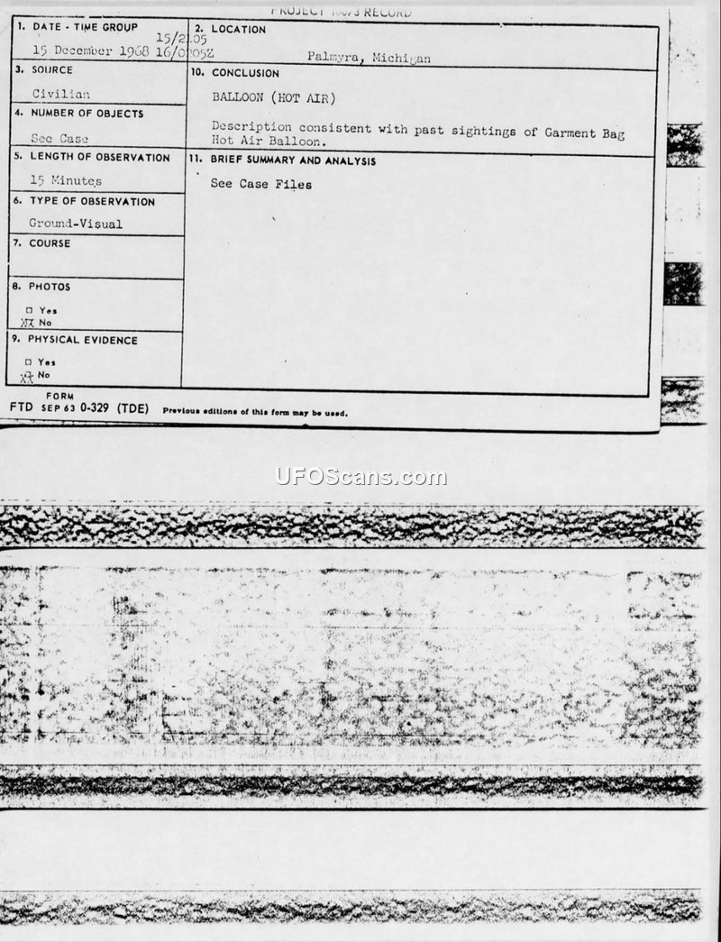 A 1968 UFO sighting report from Palmyra, Michigan, was investigated by the Air Force and officially identified as a garment bag hot air balloon.