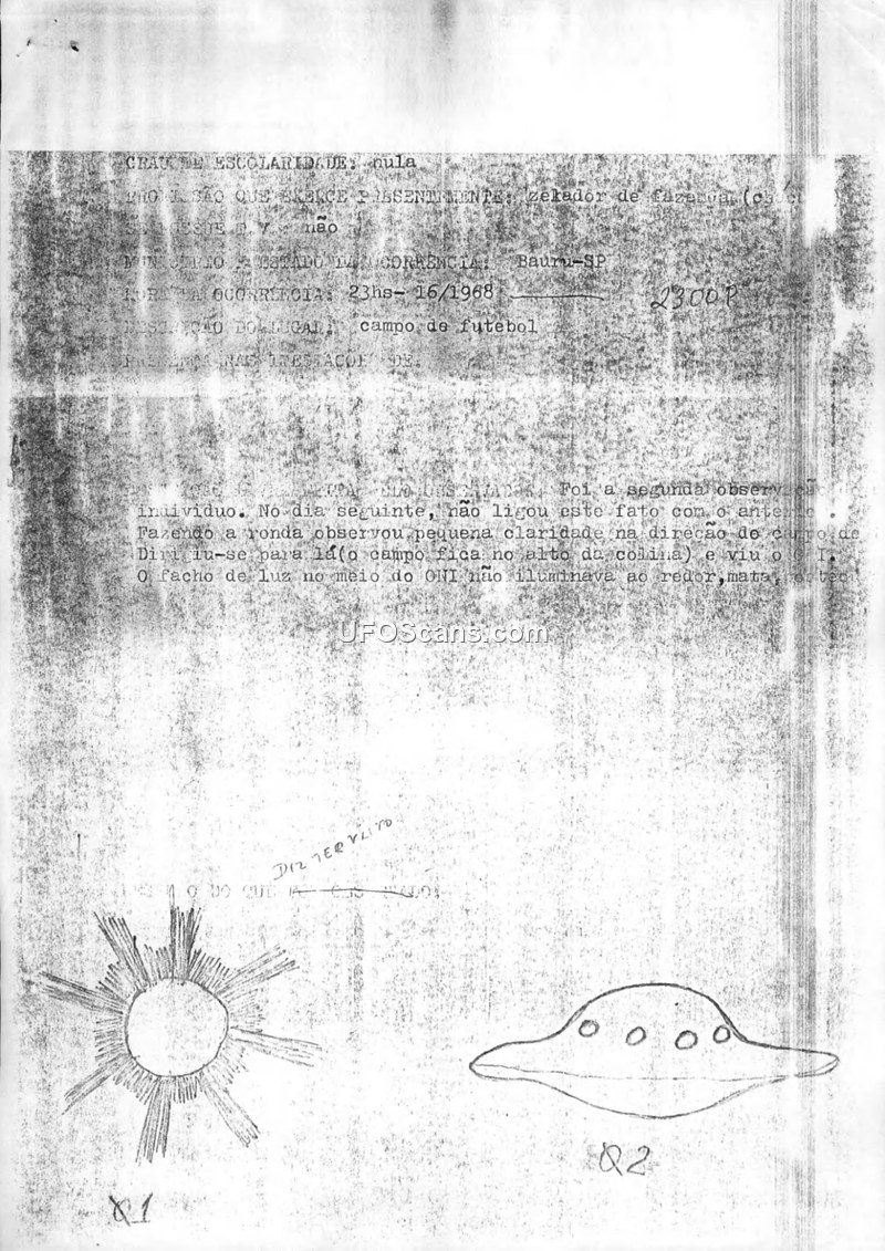 This document is a comprehensive compilation of Unidentified Aerial Phenomena (UAP/OANI) sighting reports from Brazil, primarily occurring in 1968. The file includes individual case reports detailing witness accounts, locations, and descriptions of the objects observed. Many of the reports follow a structured format, documenting the witness's education, profession, and specific details of the sighting, including the shape, color, and behavior of the objects. Common descriptions include disc-shaped or oval objects, often metallic or glowing, with some reports mentioning windows, landing gear, or specific light patterns. Several witnesses reported physiological effects, such as paralysis or intense fear, during their encounters. In addition to the sighting reports, the document contains correspondence from the Newchapel Observatory in London to the Brazilian Embassy. The observatory was in the process of compiling a 'Manual for Investigators and Researchers' regarding UAP and sought information from various nations regarding their official stance, statistical data, and civil organizations dedicated to UAP research. The correspondence highlights an international effort to standardize the investigation of these phenomena, with mentions of contributions from prominent researchers like L.J. Lorenzen and Professor James E. McDonald. The reports themselves cover a wide range of locations across the state of São Paulo, including Bauru, Lins, Piracicaba, Jahu, and Botucatu, involving witnesses from diverse professional backgrounds, such as agronomists, teachers, guards, and laborers. The document serves as a historical record of the intense UAP activity reported in Brazil during 1968 and the subsequent efforts by international researchers to gather and analyze this data.