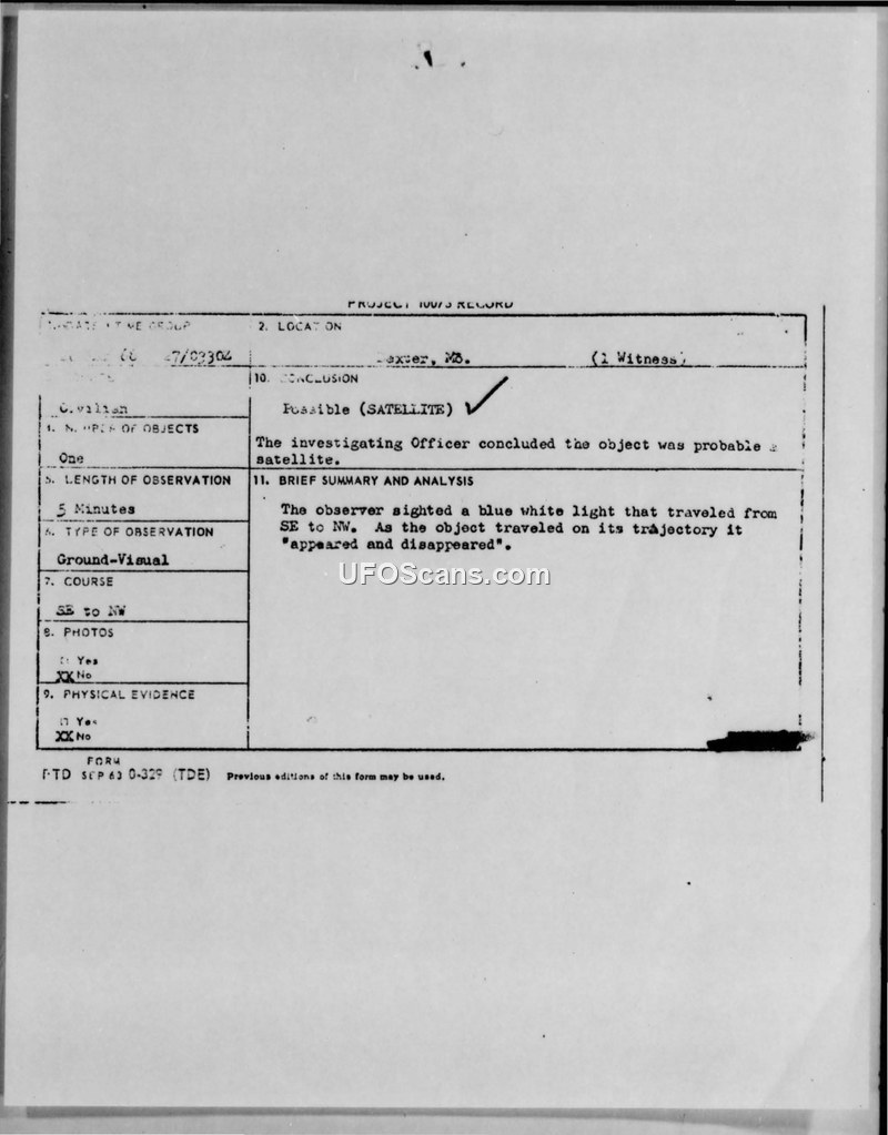 A March 1968 sighting of a blue-white light in Dexter, Missouri, was investigated by the military. The object was officially identified as a probable satellite.