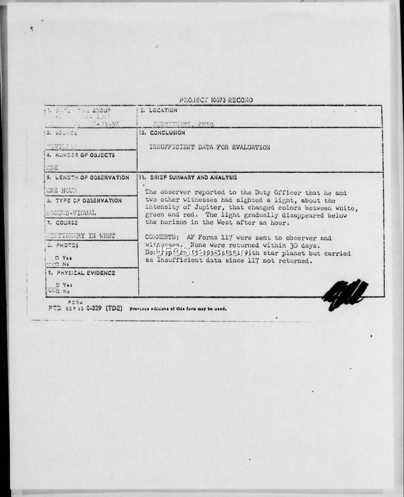 The sighting was initially reported as a light with the intensity of Jupiter that changed colors. The Air Force concluded it was likely a star or planet, but the case was closed as insufficient data because the witness failed to return the requested AF Form 117.