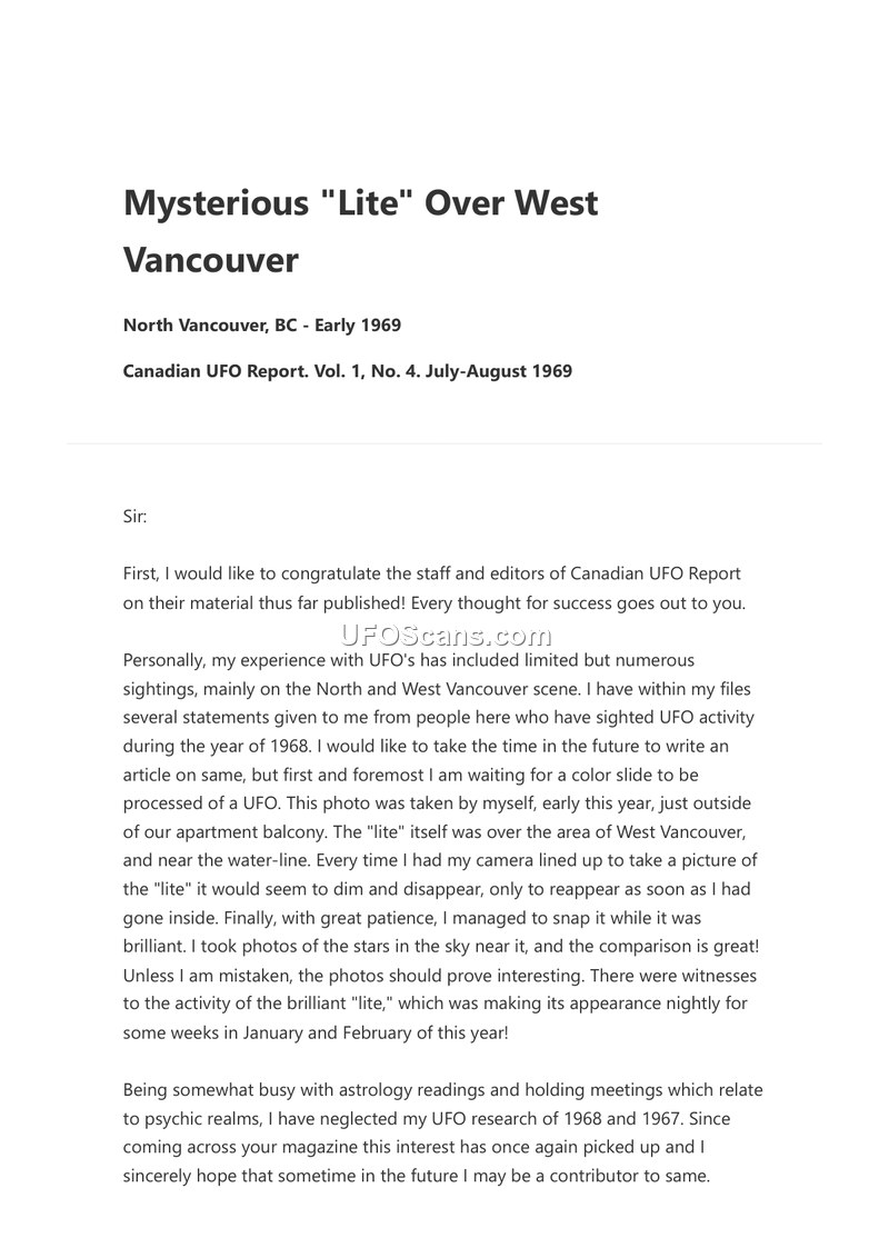 This document is a letter to the editor of the Canadian UFO Report, published in the July-August 1969 issue (Vol. 1, No. 4). The author, Muriell Anne Kvan of North Vancouver, B.C., writes to express her appreciation for the magazine and to share her personal experiences with UFO sightings. Kvan reports observing a 'brilliant' light over the West Vancouver area near the water-line during January and February 1969. She notes that the object would dim and disappear whenever she attempted to photograph it, only to reappear once she went back inside. She claims to have successfully captured the object on a color slide, which she was waiting to have processed at the time of writing. Kvan also mentions that she possesses files containing statements from other individuals regarding UFO activity in 1968. Furthermore, the author draws a potential connection between UFO sightings and marine casualties in the region. She cites the disappearance of the tugboat 'Gulf Master' and its five-man crew on January 11, 1967, near Sechelt, B.C., noting that it occurred without an apparent reason, similar to another tugboat incident in the same area less than a month prior. She reports that another tugboat had recently gone down in the area, and suggests that the frequency of UFO sightings near these locations warrants further investigation. The editor of the Canadian UFO Report adds a note at the end of the letter, directing readers to a letter from consulting editor Brian Cannon in the May-June issue for more information on the alleged link between UFO activity and marine casualties.