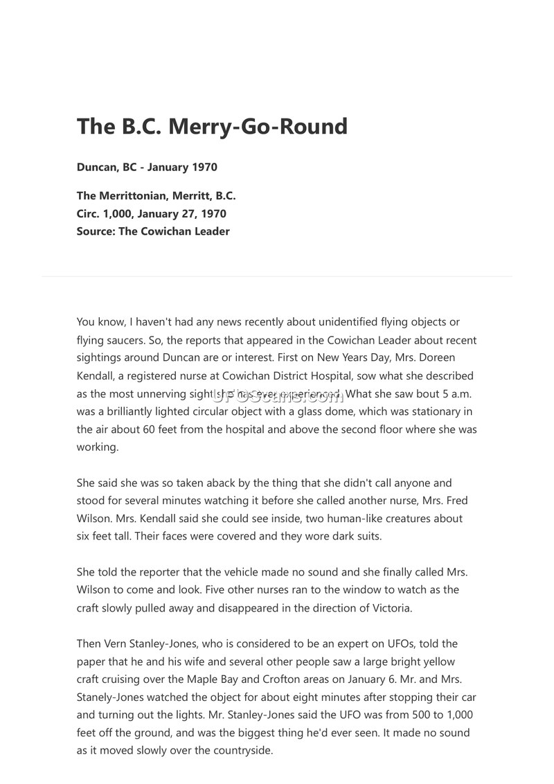 This document, published in The Merrittonian on January 27, 1970, compiles reports from The Cowichan Leader regarding a series of UFO sightings in the Duncan, British Columbia area during January 1970. The first incident occurred on New Year's Day at approximately 5 a.m., when Mrs. Doreen Kendall, a nurse at Cowichan District Hospital, observed a brilliantly lighted circular object with a glass dome hovering about 60 feet from the hospital. Mrs. Kendall reported seeing two human-like creatures, approximately six feet tall, wearing dark suits and having covered faces inside the craft. The object made no sound and was witnessed by several other nurses before it departed toward Victoria. A second sighting occurred on January 6, involving Vern Stanley-Jones, described as a UFO expert, and his wife. They observed a large, bright yellow craft cruising over the Maple Bay and Crofton areas for about eight minutes at an altitude of 500 to 1,000 feet. Mr. Stanley-Jones noted the object was silent and the largest thing he had ever seen. Additional sightings in the Duncan area on the same night were reported by Mr. and Mrs. Arthur LeQuesne, Mrs. Kay Clinehens, and Mrs. Merrill.