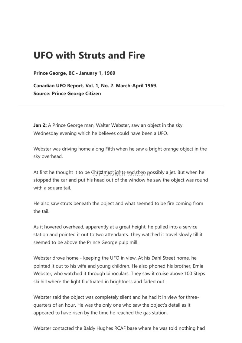 This document, published in the Canadian UFO Report (Vol. 1, No. 2, March-April 1969) and sourced from the Prince George Citizen, details a series of UFO sightings occurring in Prince George, British Columbia, on the evening of January 1, 1969. The primary witness, Walter Webster, reported observing a bright orange, round object with a square tail and struts beneath it, accompanied by what appeared to be fire emanating from the tail. Webster observed the object for approximately 45 minutes, noting that it was completely silent. He alerted his brother, Ernie Webster, who observed the object through binoculars, and later pointed it out to service station attendants and his own family. Webster contacted the Baldy Hughes RCAF base, which reported no unusual radar activity, and the RCMP, who had received no other reports at that time. On January 3, two additional witnesses, Grant Magnuson and Mrs. H.L. Hamel, came forward with independent accounts. Magnuson, who had previously studied logical explanations for UFOs, described the object as an orange-yellow light, roughly one-eighth the size of the moon, which appeared stationary before moving slowly and eventually fading out. He noted a corona or halo effect around the object. Mrs. Hamel reported observing the object while driving with her family and noted that she had seen a similar phenomenon in February of the previous year, describing it then as a light on top of a cone. Both witnesses reported the event to local authorities, including the RCMP and the local weather station, though no official explanation was provided.