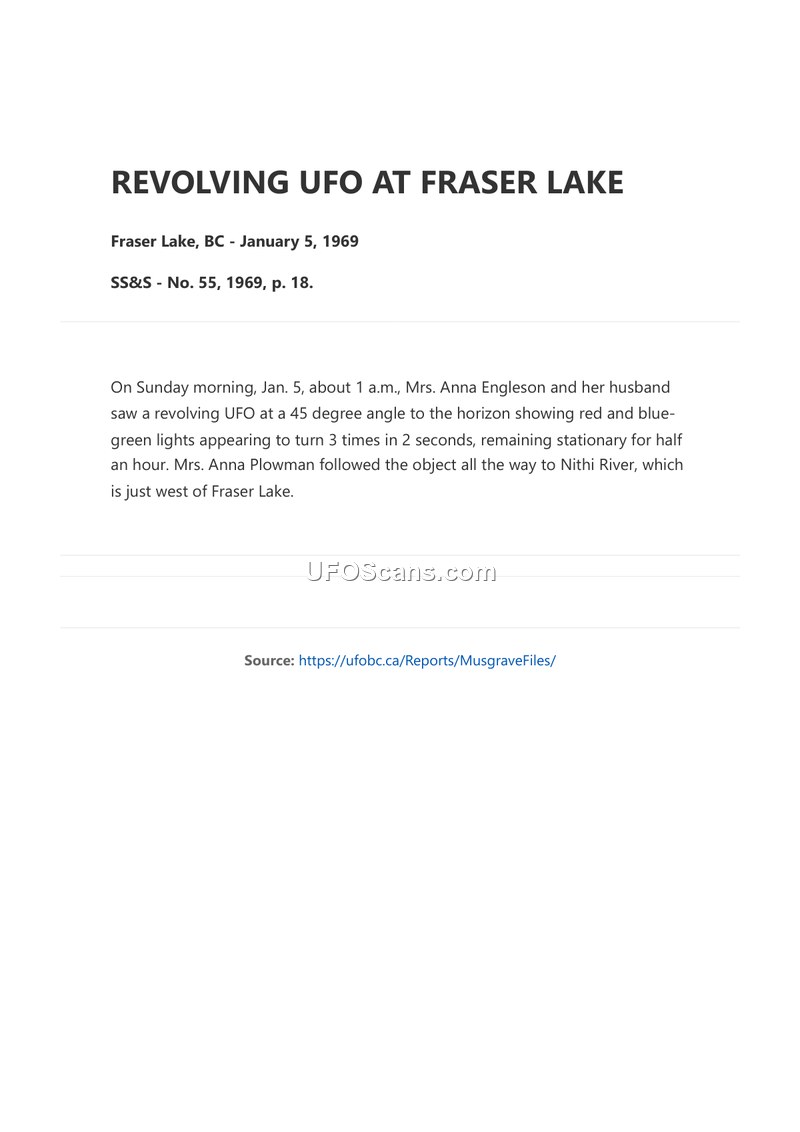 On the morning of January 5, 1969, at approximately 1:00 a.m., a sighting occurred near Fraser Lake, British Columbia. Mrs. Anna Engleson and her husband observed a revolving unidentified aerial object positioned at a 45-degree angle relative to the horizon. The object displayed red and blue-green lights and was observed to rotate three times within a two-second interval. The object remained stationary for a duration of thirty minutes. Subsequently, Mrs. Anna Plowman tracked the movement of the object as it traveled to the Nithi River, a location situated just west of Fraser Lake.