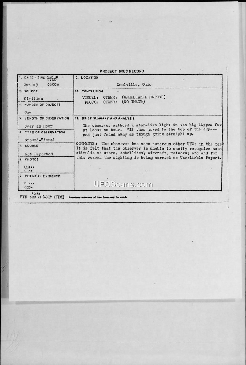This document contains a Project 10073 record regarding a UFO sighting in Coolville, Ohio, in January 1969. The witness reported observing a star-like light in the Big Dipper for over an hour, which subsequently moved to the top of the sky and faded away. The witness also submitted a photograph of the object. The official analysis, conducted by Lt. Col. Hector Quintanilla, Jr. of the Aerial Phenomena Branch, concluded that the report was unreliable. The investigation determined that the witness was unable to accurately identify common stimuli such as stars, satellites, aircraft, or meteors. Furthermore, an examination of the negative provided by the witness failed to reveal any image that could be classified as a UFO. The document includes correspondence from the witness, who claimed to have seen multiple UFOs since 1967, including a 'ball of fire' and a red light over Lottridge, Ohio. The witness expressed a belief that these objects might be from outer space or manufactured by the government. The Air Force returned the negative to the witness, noting that the photographic evidence was inconclusive.