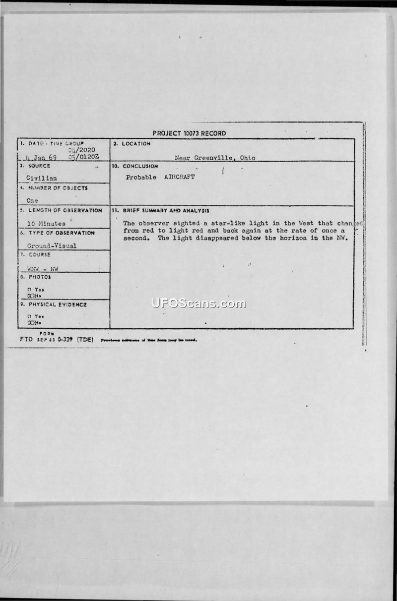 Project 10073 Record — Sighting near Greenville, Ohio, 4 January 1969