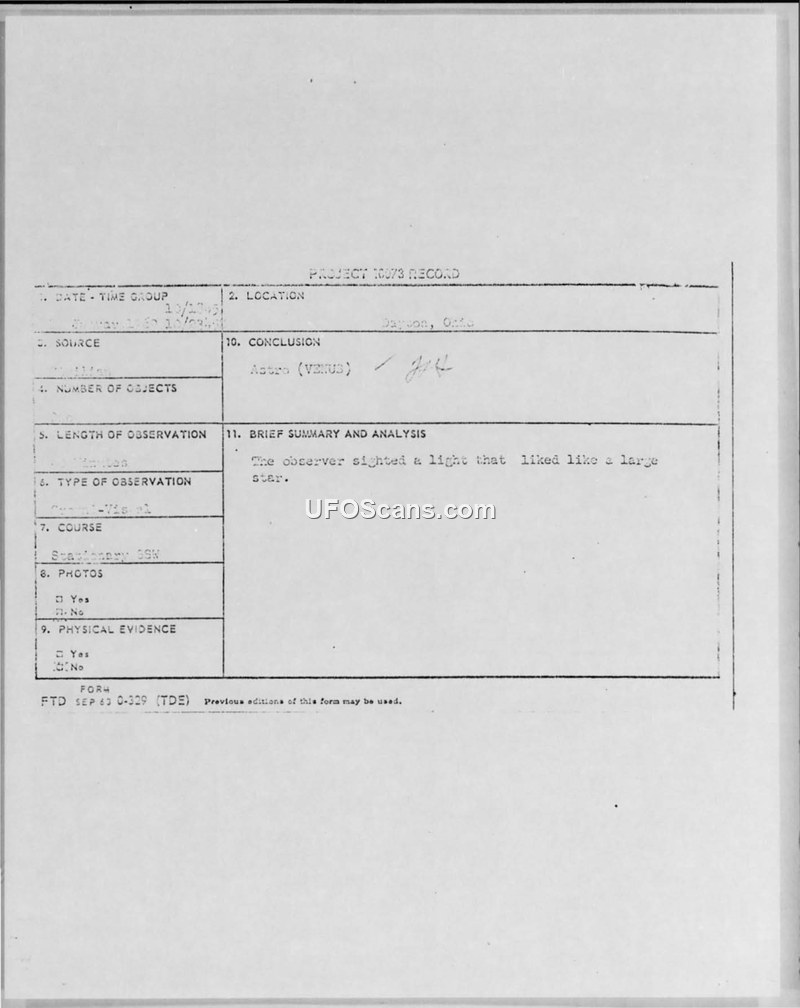 A 1969 sighting report from Dayton, Ohio, involving a 15-year-old witness who observed a light resembling a large star. The Foreign Technology Division concluded the object was the planet Venus.
