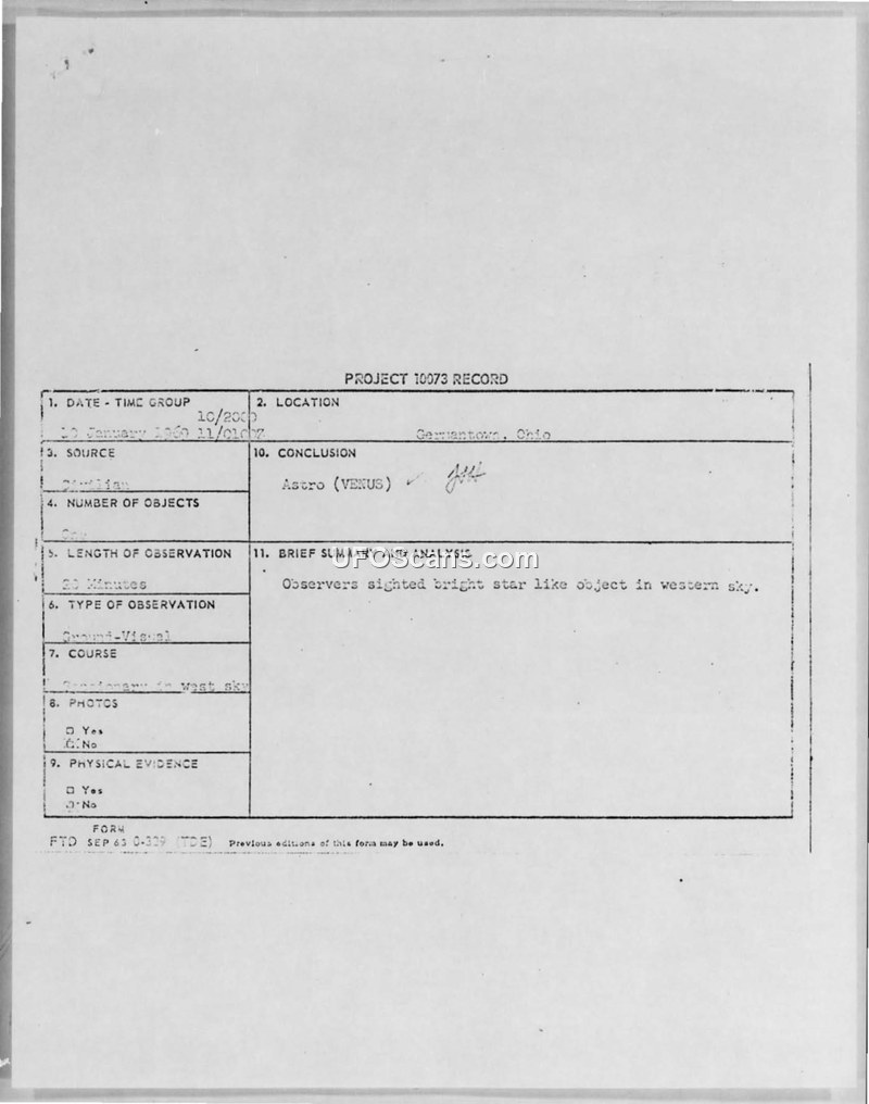 A civilian in Germantown, Ohio, reported a 20-minute sighting of a bright, whirling object on January 10, 1969. The Air Force officially concluded the object was the planet Venus.