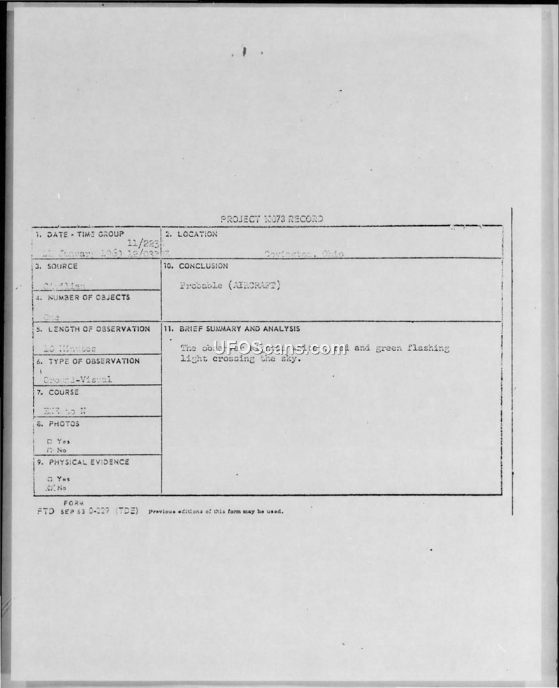 A civilian in Covington, Ohio, reported a flashing light in the sky on January 11, 1968. The Air Force investigation concluded the object was likely an aircraft.
