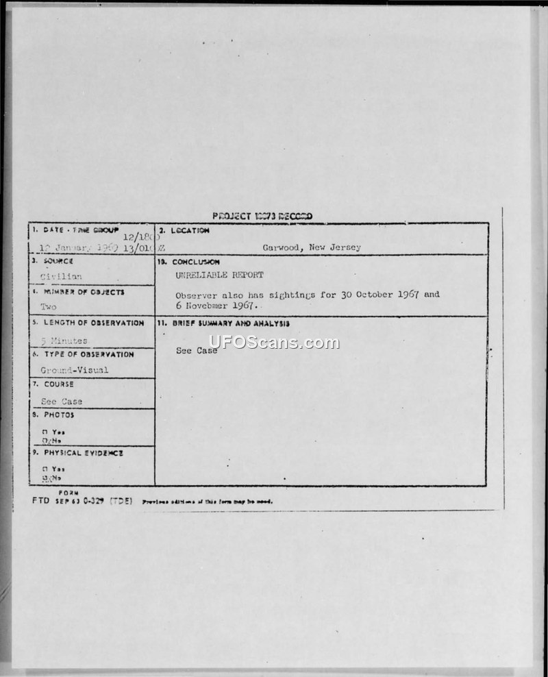 A civilian report of two objects in Garwood, New Jersey, on 12 January 1969, which was officially classified as an unreliable report by the U.S. Air Force.