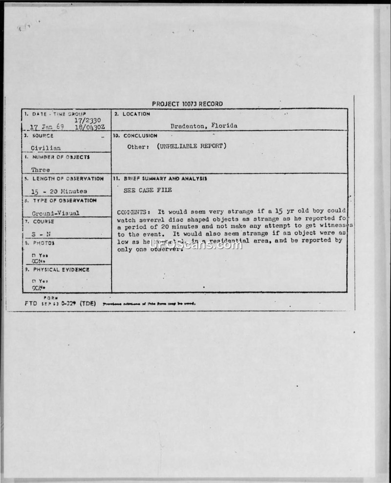 Project 10073 Record: UFO Observation, 17 January 1969, Bradenton, Florida