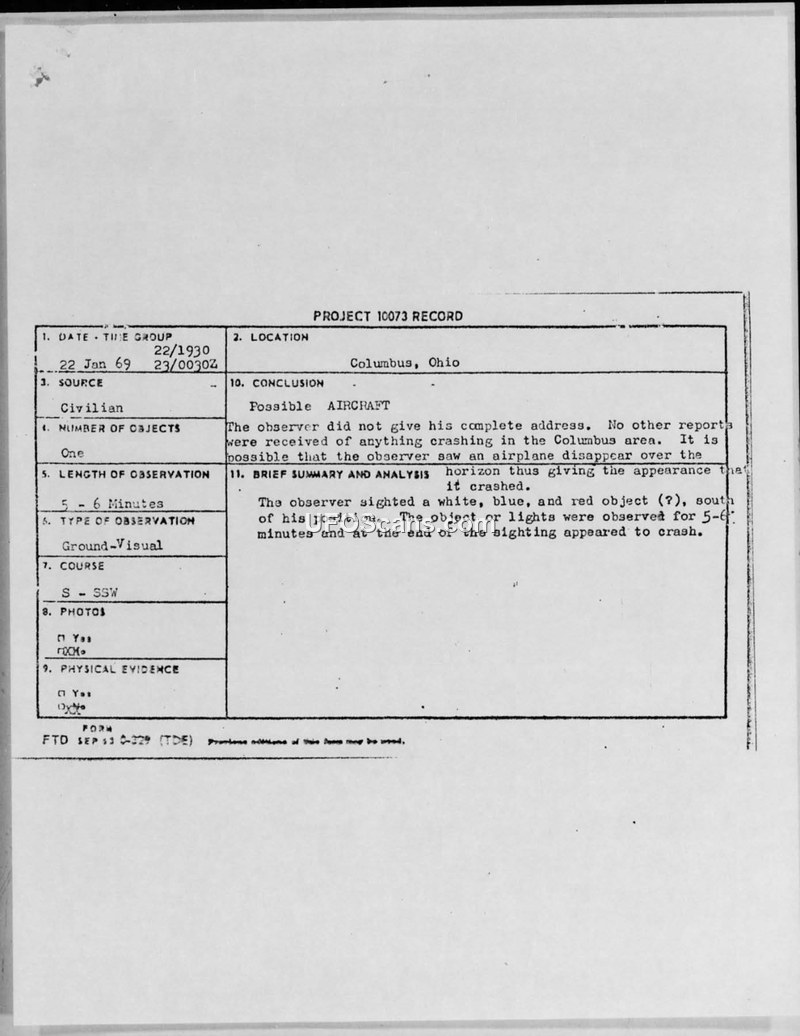 Project 10073 Record — Columbus, Ohio, 22 January 1969