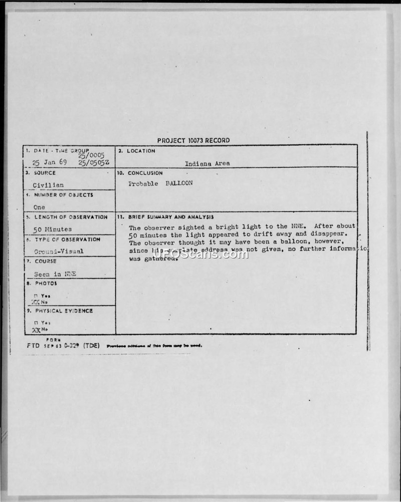 A civilian at Crane Depot, Indiana, reported a 50-minute sighting of a bright, color-changing light on January 25, 1969. The Air Force concluded the object was a probable balloon.