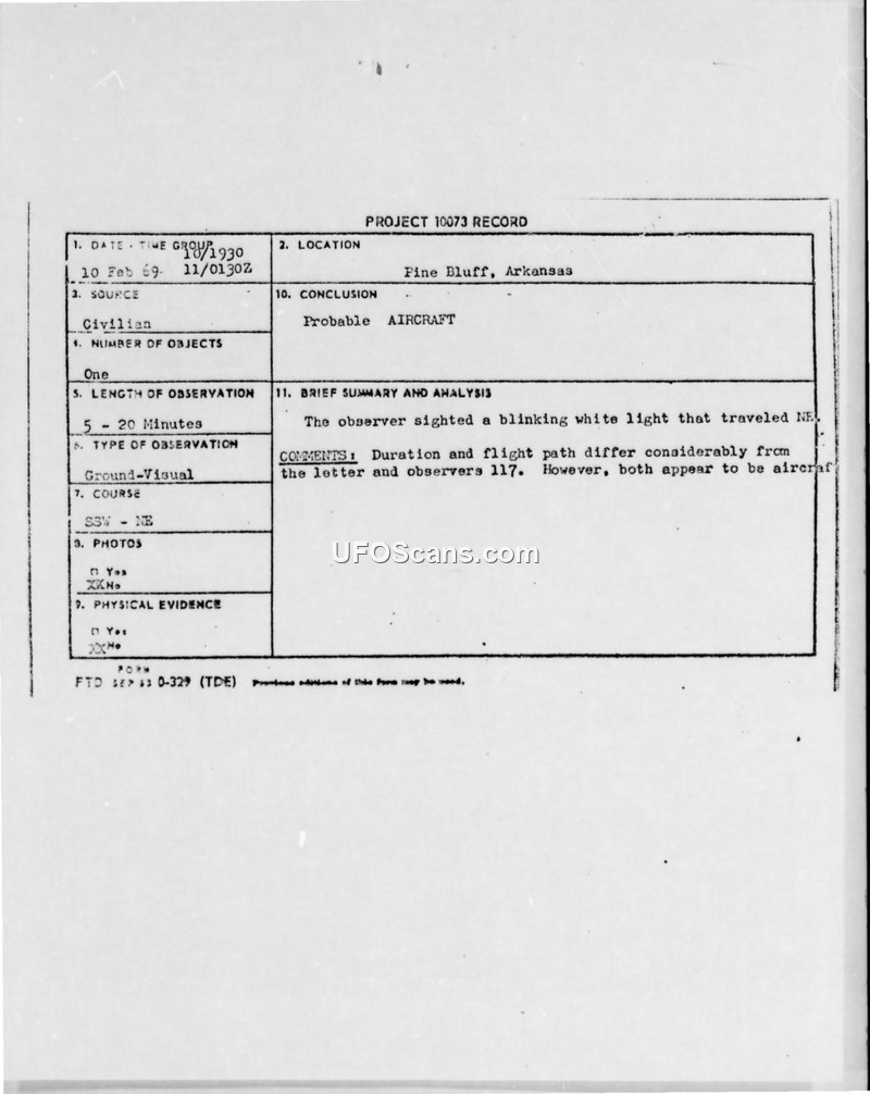 Project 10073 Record — Sighting in Pine Bluff, Arkansas, 10 February 1969