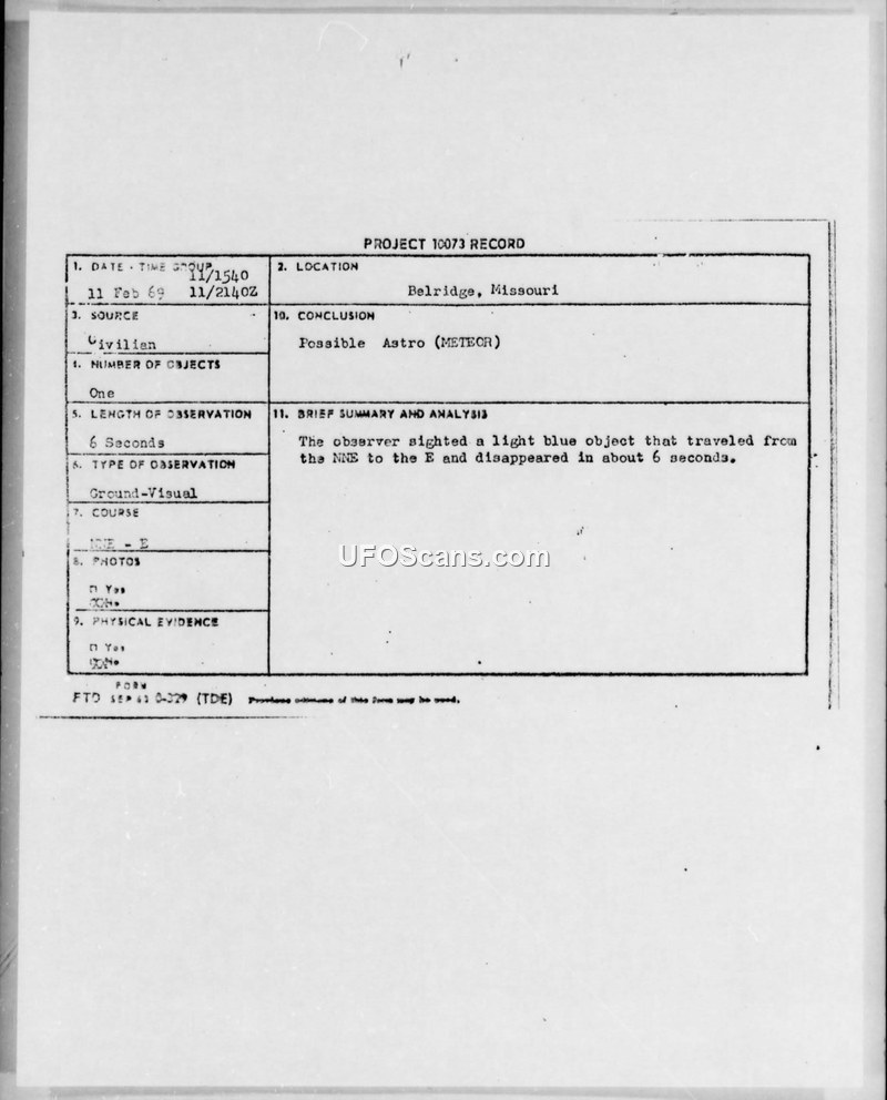 A civilian reported a light blue, high-speed object in Belridge, Missouri, on 11 February 1969. The Air Force evaluated the sighting as a possible meteor.