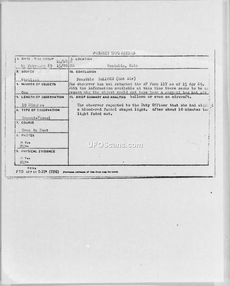 A witness in Vandalia, Ohio, reported a blood-red, funnel-shaped light on February 14, 1969. The Air Force concluded the object was likely a hot air balloon or aircraft after the witness failed to provide further requested documentation.