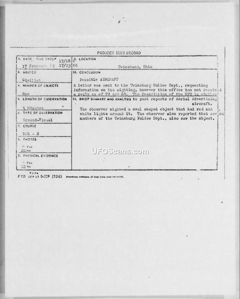 Project 10073 Record — Twinsburg, Ohio, 17 February 1969