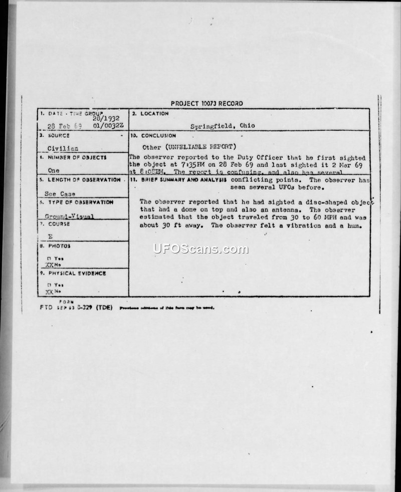 Project 10073 Record: Sighting Report - Springfield, Ohio, 28 February 1969