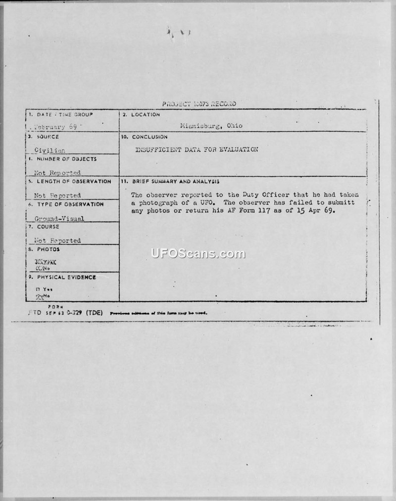 A civilian reported a UFO sighting in Miamisburg, Ohio, in February 1969 but failed to provide the promised photographic evidence or required documentation. The Air Force concluded the case as having insufficient data for evaluation.