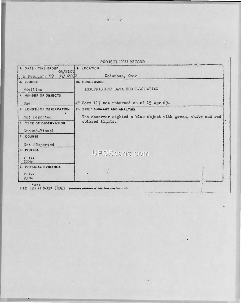 Project 10073 Record — Sighting in Columbus, Ohio, February 4, 1969