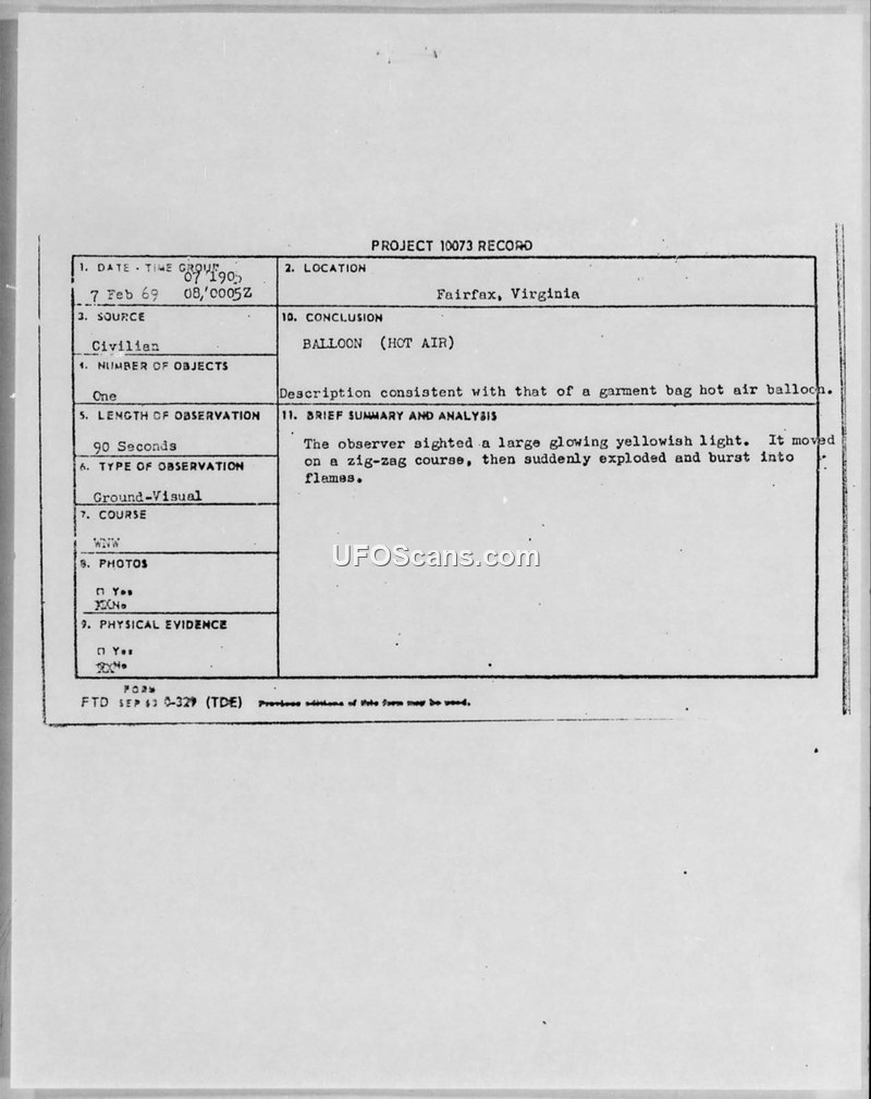 This document contains a Project 10073 record regarding a UFO sighting reported in Fairfax, Virginia, on February 7, 1969. The witness, an Assistant Professor of Business Administration at Northern Virginia Community College and a retired Air Force officer with 22 years of service, observed a large, glowing, yellowish light at approximately 7:05 PM. The object was described as moving in a zig-zag course from west to east at an altitude of about 30 degrees above the horizon. The witness noted that the object brightened before suddenly exploding and bursting into flames, which he described as a wall of fire. The observation lasted approximately 90 seconds. The witness reported the incident to the Fairfax County Police and the FAA Flight Service at National Airport, neither of which had other reports. He subsequently contacted Andrews AFB to file an official report. In his questionnaire, the witness explicitly stated that he did not believe the object was anything unusual, noting his familiarity with UFO reports from his military background. The official Air Force conclusion, signed by Lt. Col. Hector Quintanilla, Jr., identified the phenomenon as a hot air garment bag balloon, noting that the description was consistent with past sightings of such objects.