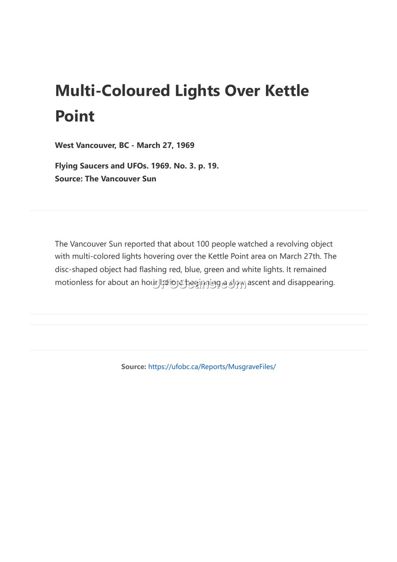 A report from The Vancouver Sun details a sighting of a disc-shaped object with multi-colored lights by approximately 100 people in West Vancouver on March 27, 1969. The object hovered for an hour before ascending and disappearing.