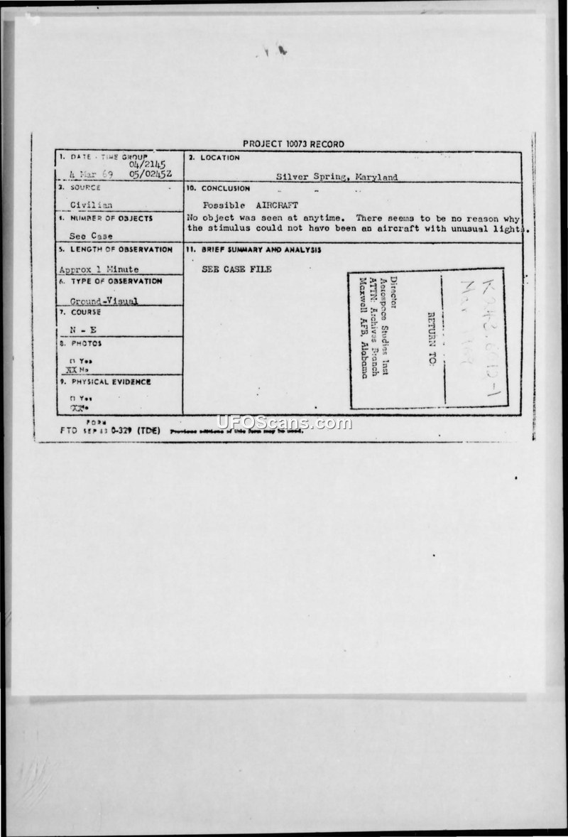 Project 10073 Record — Sighting in Silver Spring, Maryland, 4 March 1969