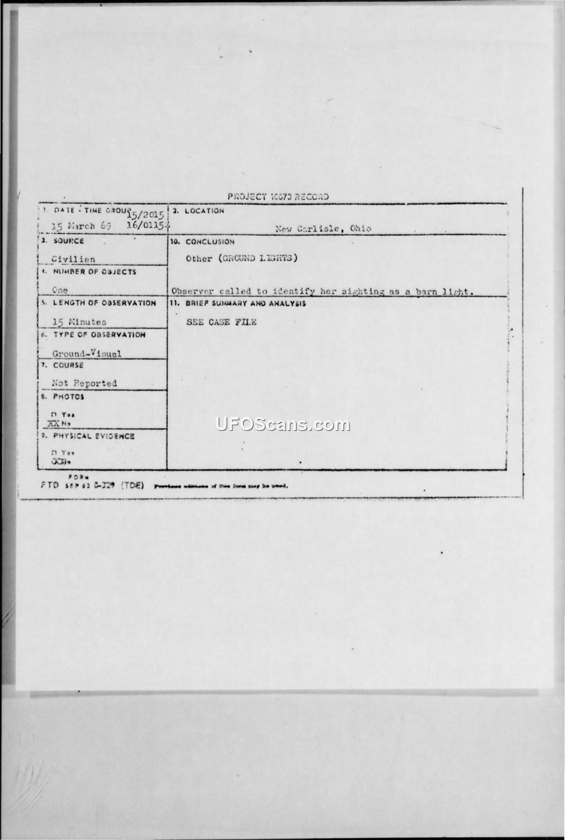 A civilian observer in New Carlisle, Ohio, reported two sightings in March 1969, one of which was identified as a barn light. The observer also reported physical symptoms, including a rash, following the first sighting.