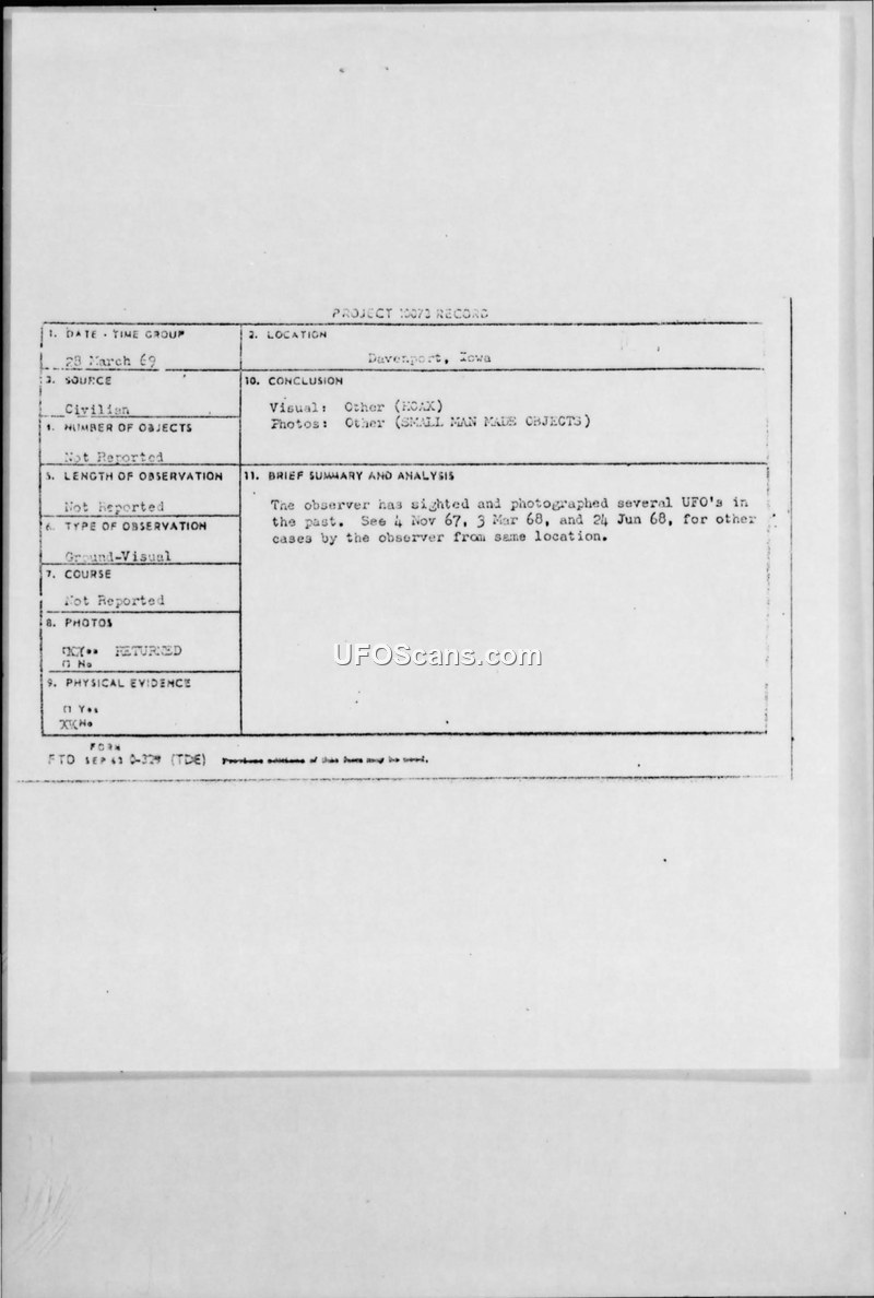 This document is a compilation of reports, correspondence, and weather data related to UFO sightings in March 1969, primarily associated with Project Blue Book and NICAP. It includes a specific incident report involving Bill Overstreet, a star route mail deliverer from Elmer, Missouri. Overstreet reported observing a reddish-colored ball, approximately 100 feet in diameter, hovering 50 feet above the ground on a Tuesday morning. He described the object as changing color to a bluish-white, emitting intense heat, and causing his truck's engine and citizen's band radio to stop when he drove under it. The object moved at approximately 40 miles per hour before veering north and then southeast toward Macon. The document also contains correspondence from Lt. Col. Hector Quintanilla, Jr. of the USAF Aerospace Technologies Division, addressing a correspondent in Davenport, Iowa, regarding photos of a UFO. The USAF concluded that the photos were of small man-made objects. Additionally, the file includes various daily weather maps for March and April 1969, and statistical profiles of UFO reports for March 1969, noting that there were no reports in the 'unknown' category for that month. The document reflects the administrative process of the USAF in handling civilian UFO reports during this period.