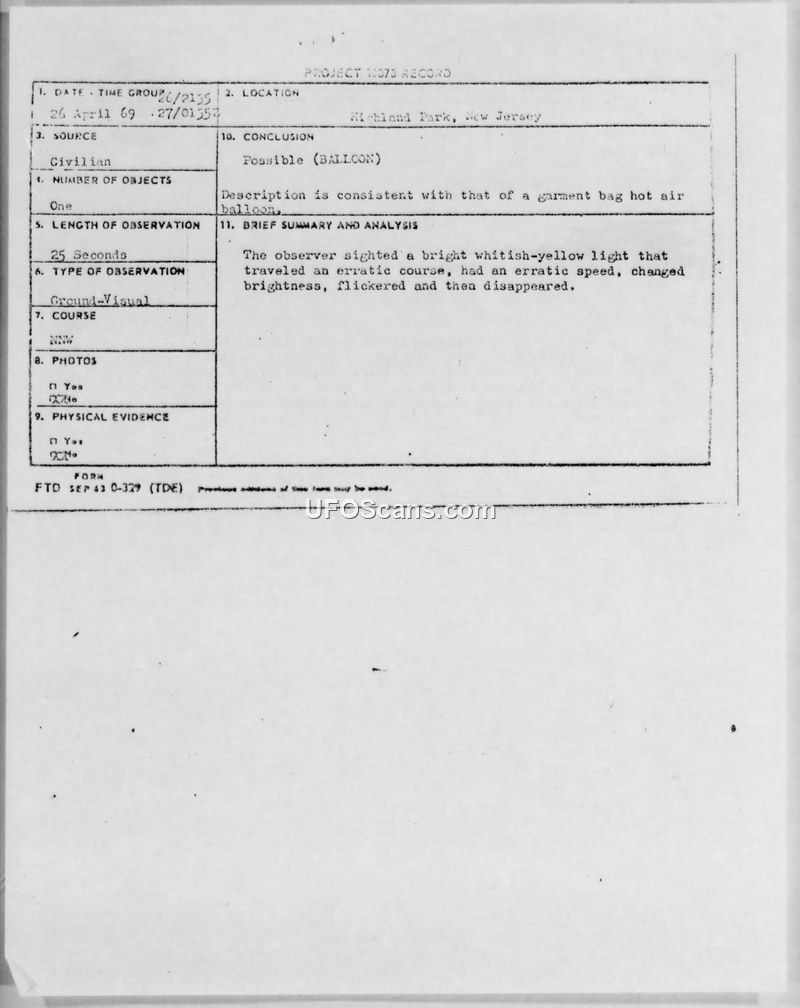 A 14-year-old witness reported a bright, self-luminous, bowl-shaped object in Highland Park, New Jersey, on April 26, 1969. The Air Force investigated the report and concluded the object was likely a garment bag hot air balloon.