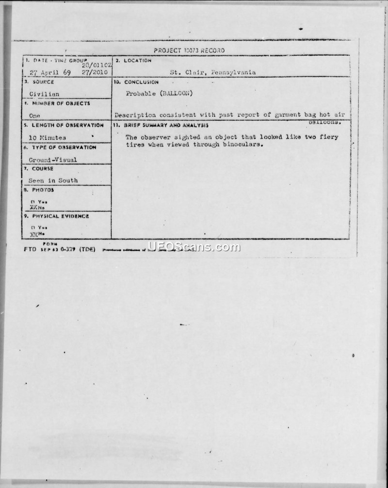 Project 10073 Record — St. Clair, Pennsylvania, 27 April 1969