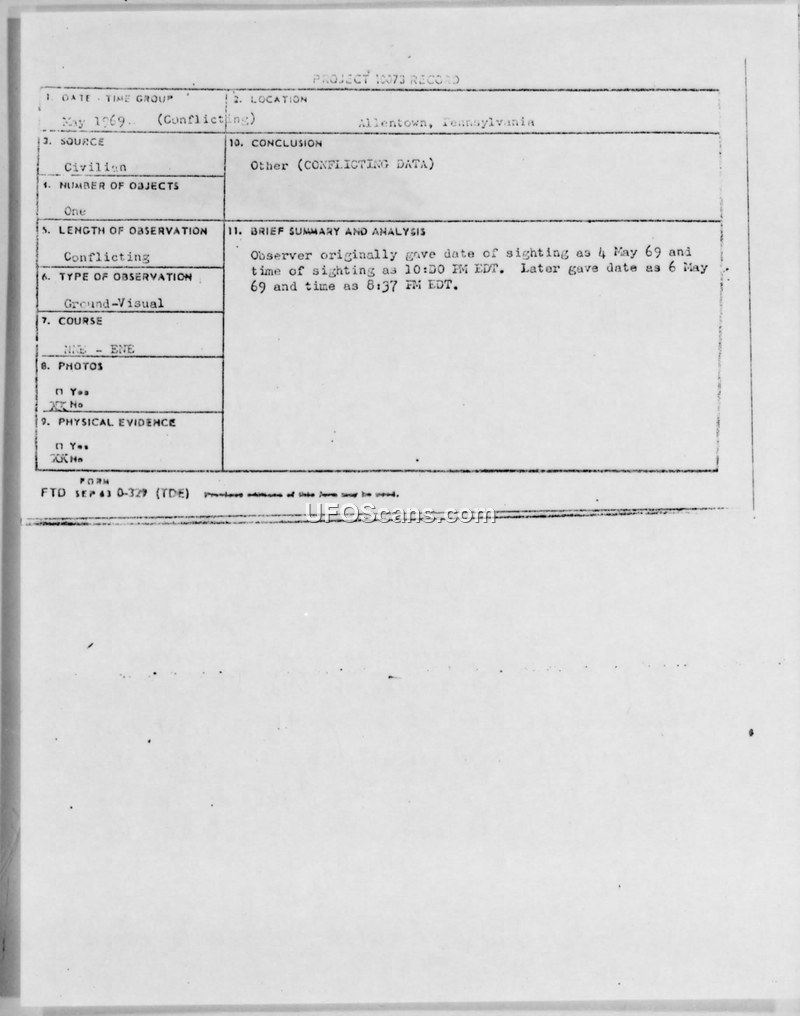 Project 10073 Record — Allentown, Pennsylvania, May 1969