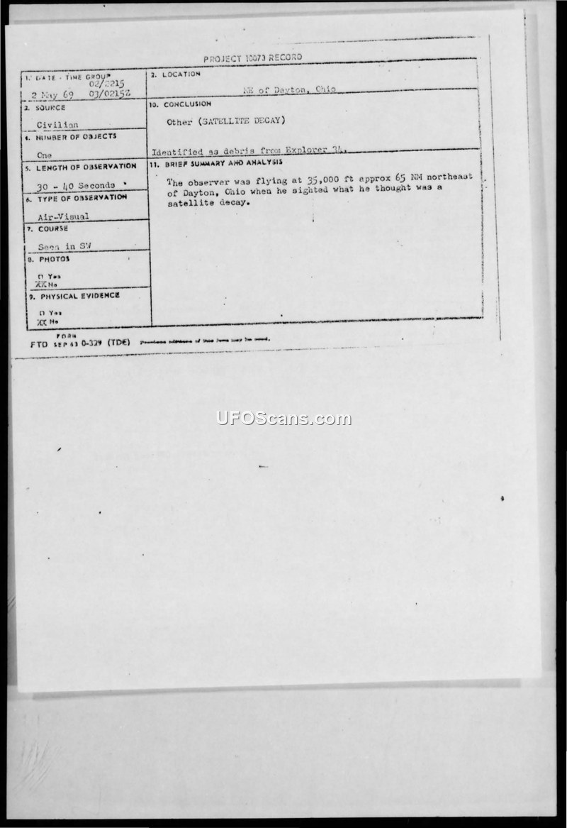 A pilot reported an unidentified aerial phenomenon on May 2, 1969, over Ohio. The Air Force investigated the report and concluded it was the decay of the Explorer 34 satellite.