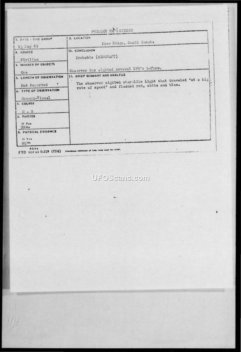 Project Blue Book Sighting Report — Pine Ridge, South Dakota, May 13, 1969