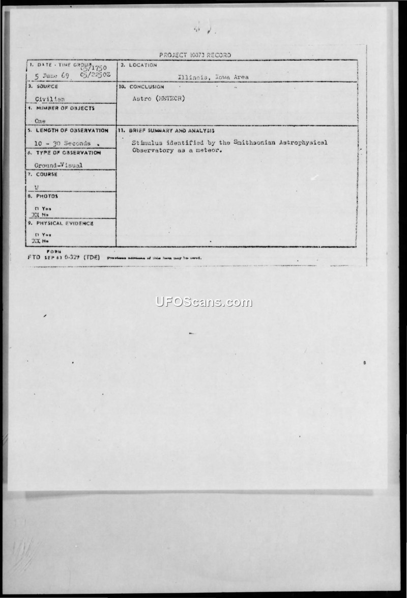 Project Blue Book Sighting Report — Illinois/Iowa Area, June 5, 1969