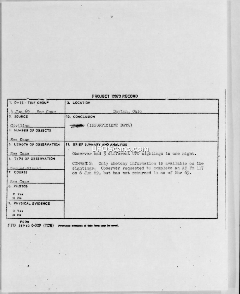 An unidentified aerial phenomenon was reported in Dayton, Ohio, on June 4, 1969. The Air Force classified the case as 'insufficient data' after the witness failed to return a requested follow-up form.