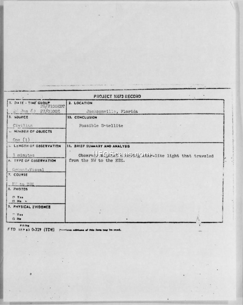 Project 10073 Record — Sighting Report, Jacksonville, Florida, 26 June 1969