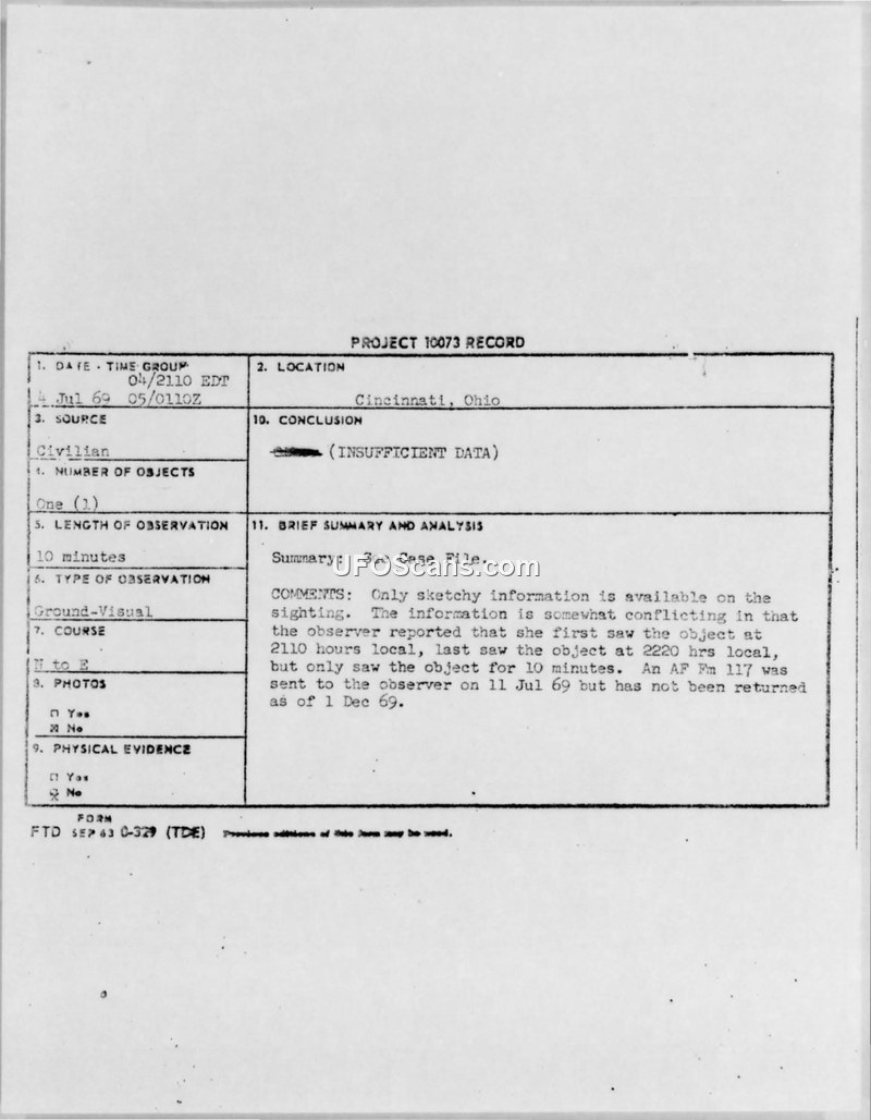 This document contains a Project 10073 record regarding a UFO sighting reported on July 4, 1969, in Cincinnati, Ohio. The witness, a civilian, reported observing a single, saucer-shaped, shiny gold object moving from North to East. The observation lasted approximately 10 minutes. The official conclusion for the case was 'INSUFFICIENT DATA' due to conflicting reports regarding the timing of the sighting. The file includes a Sighting of Unidentified Phenomena Questionnaire (AF Form 117) completed by the witness, as well as correspondence from Lt. Colonel Hector Quintanilla, Jr., of the Aerial Phenomena Office, requesting further information. A significant portion of the document is a 'Memorandum for Record' dated July 4, 1969, written by 1st Lieutenant William C. Lewis. This memorandum details a complaint from the witness's wife regarding the treatment her husband received when he initially called the FTD Command Post to report the sighting. The witness was reportedly told by Wright Operations personnel that he was likely under the influence of intoxicants and should 'forget the matter of UFO's.' The Staff Duty Officer apologized for this behavior and recommended that the Commander of the Foreign Technology Division bring the incident to the attention of the Base Commander, noting that such behavior reflected poorly on the United States Air Force.