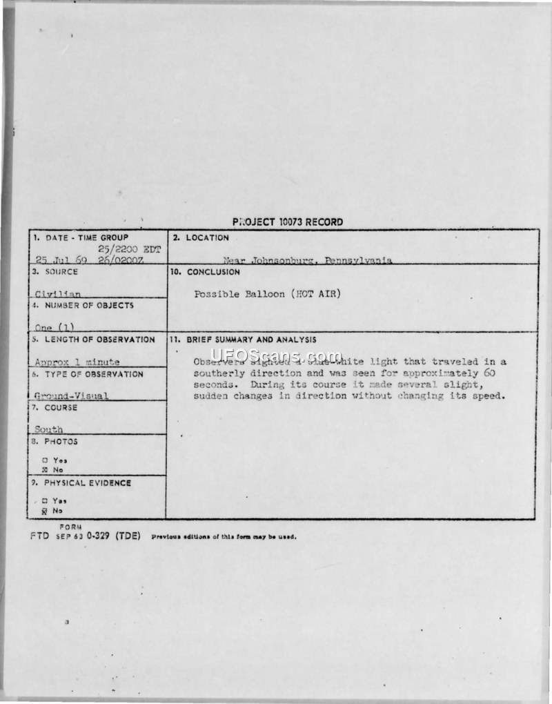 Project 10073 Record — Sighting in Johnsonburg, Pennsylvania, 25 July 1969
